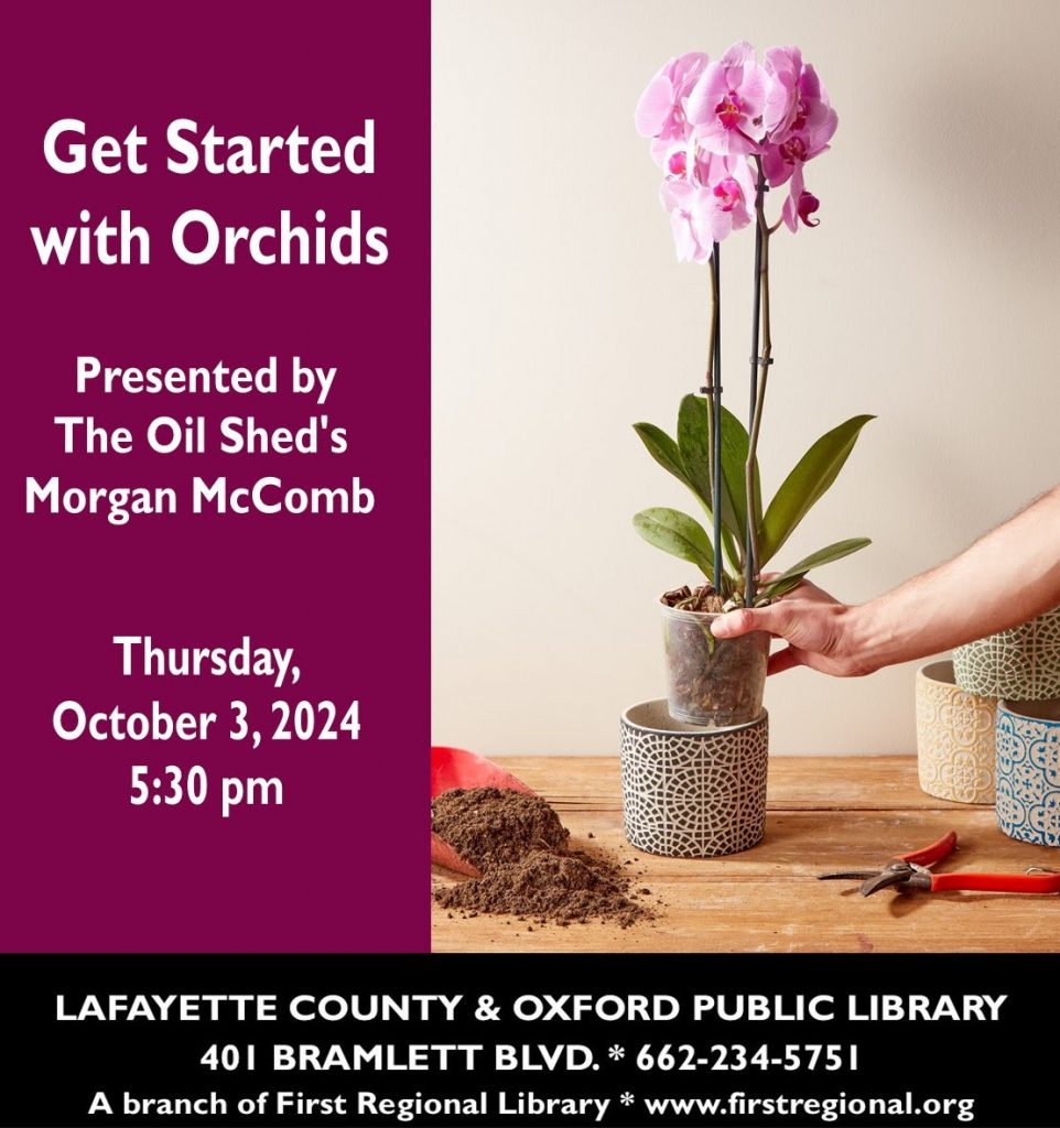 Lafayette County & Oxford Public Library: Afterschool Zone: Buttonmaking (3:45–4:45 pm); Get Started with Orchids by The Oil Shed’s MORGAN MCCOMB (5:30 pm)