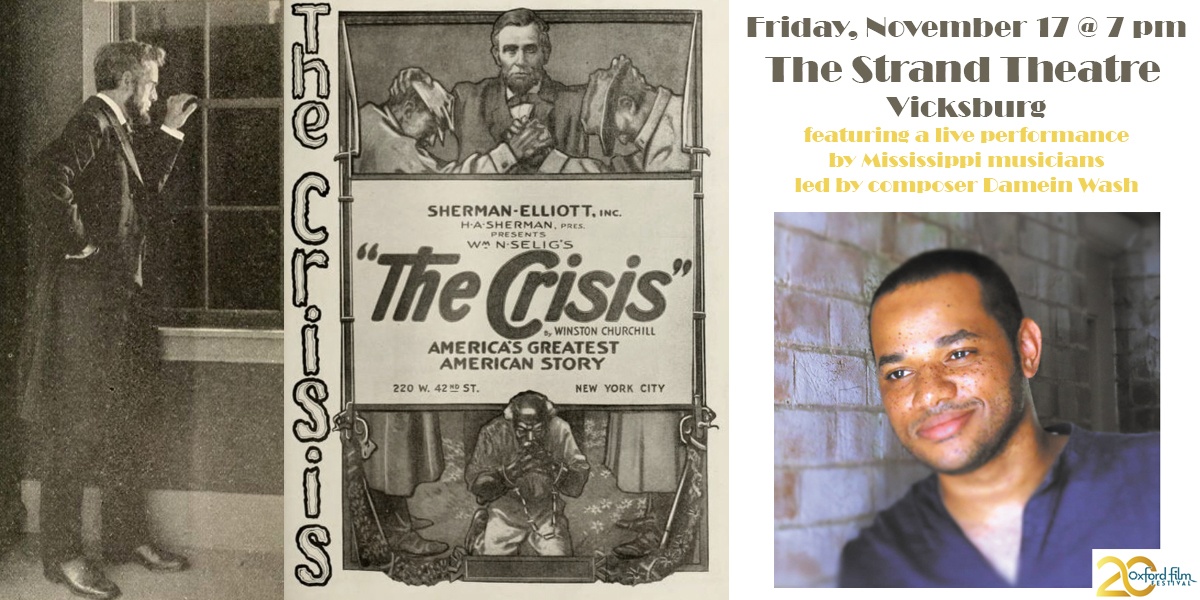 The Strand Theatre and Oxford Film Festival present a live musical performance accompanying the 1916 silent film The Crisis on Friday, November 17, at 7 pm at the Strand Theater in Vicksburg, Mississippi. Based on a Civil War drama written by American novelist Winston Churchill, The Crisis was the first feature-length film to be shot in Mississippi.