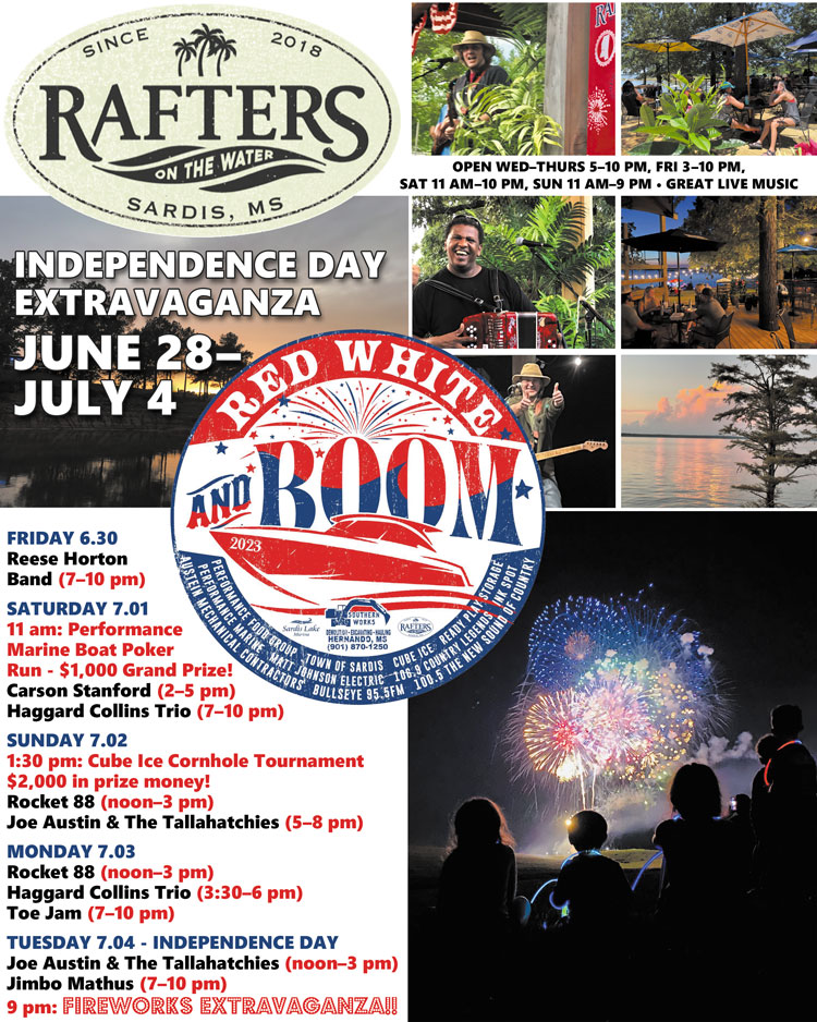 Independence Day is right around the corner, and if you’re looking for a party, Rafters on the Water has you covered with five days of live music, events, and food leading up to the grand finale: the biggest and best fireworks show in North Mississippi.