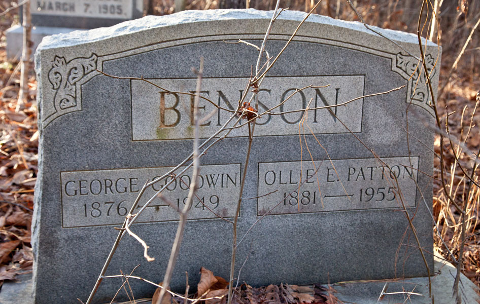 The surname on most of the tombstones was either Wright or Benson. The earliest birthdate is July 4, 1797 (William Hardy Benson). The latest death date is 1955 (Ollie Patton Benson), widow of George Goodwin Benson (died 1949).