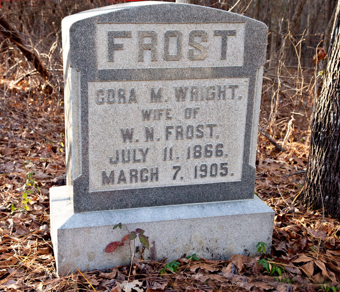 Later research has revealed that, unsurprisingly, the plot’s name is Benson Cemetery. Given the appearance of the tombstone of Ollie and George, it seems the cemetery couldn’t have been completely abandoned since 1955. I think it’s certain that the current tombstone of Cora Wright Frost has not been sitting there exposed to the elements since the spring of 1905.