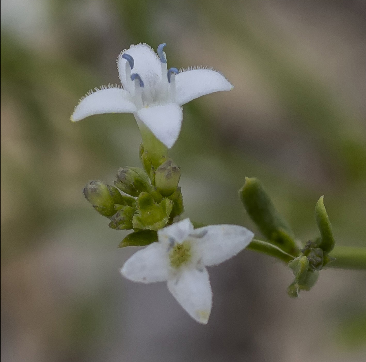 Stenaria nigricans, a perennial commonly known as bluet or diamond flower, produces small white or pale-lavender flowers with four petals arranged in a diamondlike pattern.