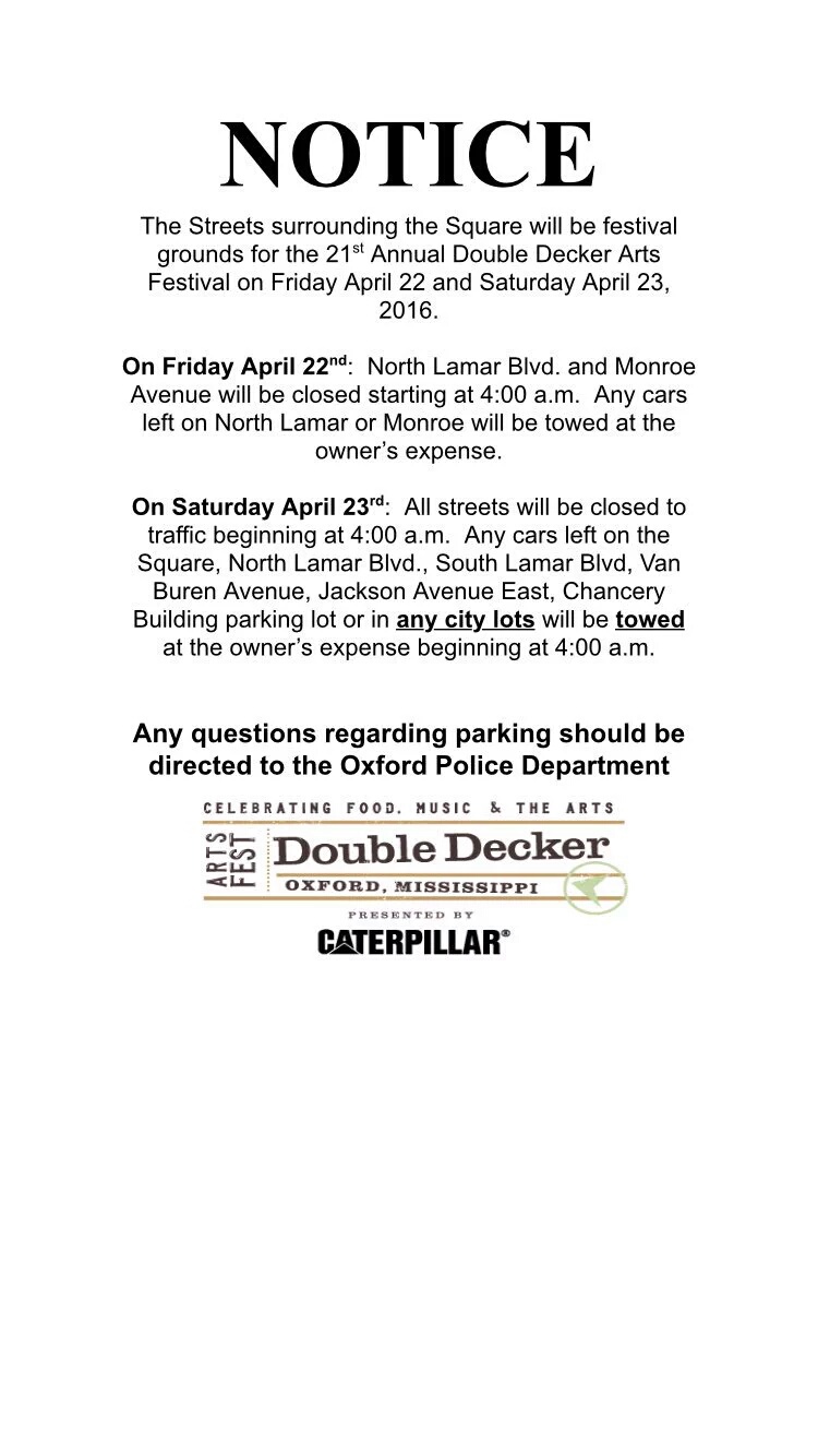 On Saturday, April 23: All streets will be closed to traffic beginning at 4 am. Any cars left on The Square, North Lamar Boulevard, South Lamar Boulevard, Van Buren Avenue, Jackson Avenue East, Chancery Building parking lot or in any City of Oxford lots will be towed at the owner’s expense beginning at 4 am. ![]()