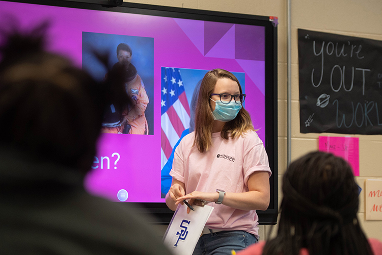 Down the hall from Sias’ class, Carley Hydrick, who works as an instruction coach of sorts with the program, was telling her students about astronaut Mae C. Jemison, the first Black woman in space, who served on the space shuttle Endeavor in 1992.