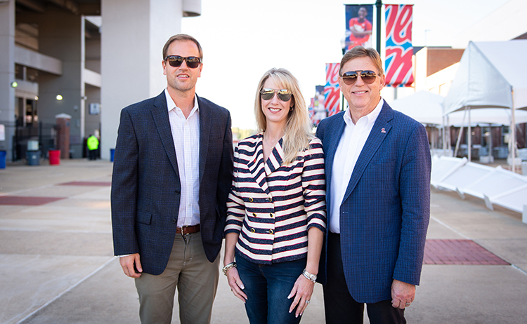 Ole Miss Athletics Foundation CEO Denson Hollis (left) greets Lori and Keith Shelly outside Vaught-Hemingway Stadium on the University of Mississippi campus. Photo by Bill Dabney/UM Foundation