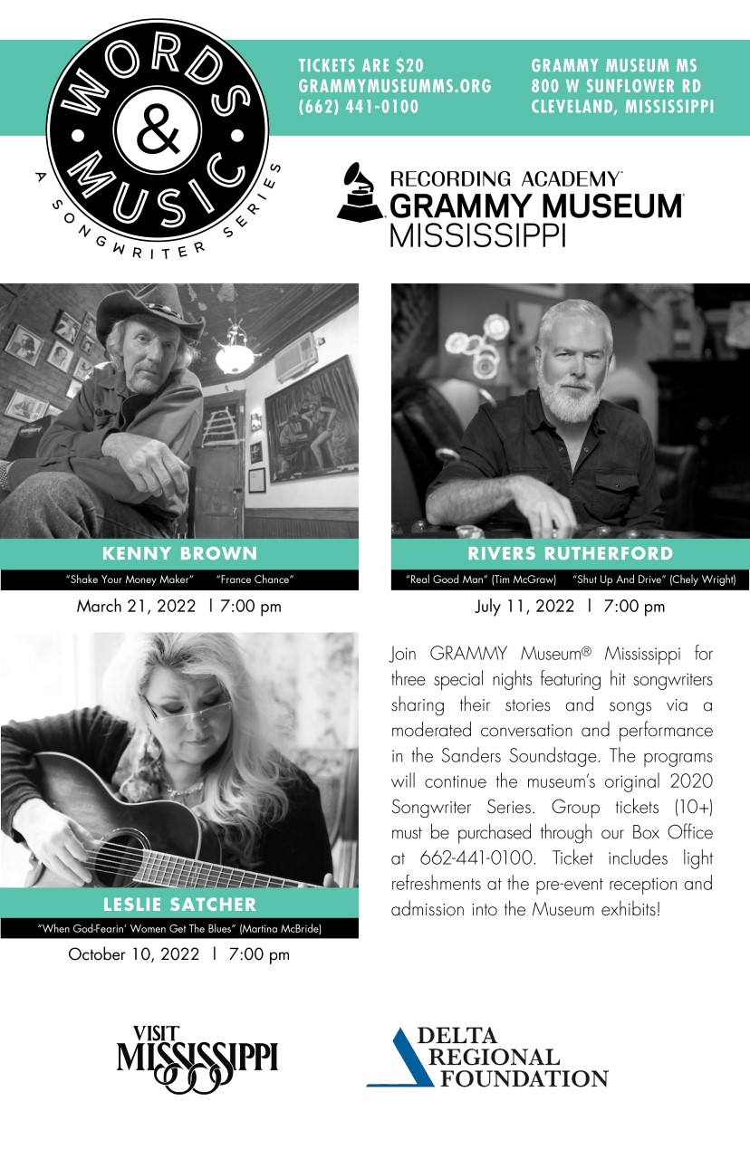 “We are so thrilled to be welcoming such talented artists and songwriters to our Museum this year,” said Emily Havens, Executive Director of GRAMMY Museum Mississippi. “Kenny Brown, Rivers Rutherford, and Leslie Satcher have all made such incredible contributions to American music, and we can’t wait to have them here to tell their stories.”