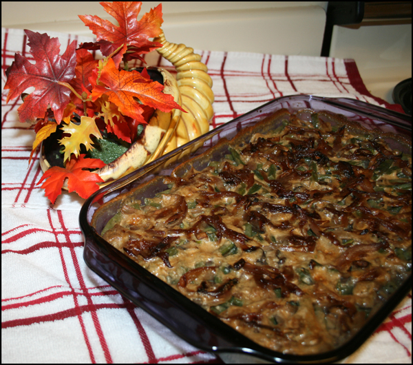 Add mushroom sauce and half of caramelized onions to waiting beans and toss until evenly mixed. Transfer mixture to shallow 2-1/2 qt. glass or ceramic baking dish; scatter remaining onions on top.