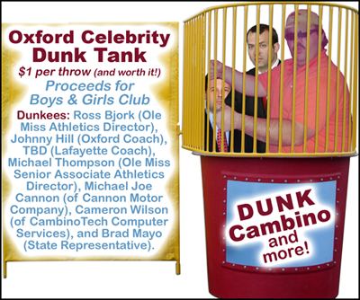 The Council will have the following local celebrity dunk tank participants: Ole Miss Athletics Director Ross Bjork, Oxford Coach Johnny Hill, Missississippi Representative Brad Mayo, Ole Miss Senior Associate AD Michael Thompson, Michael Joe Cannon of Cannon Motor Company, Cameron Wilson of CambinoTech Computer Services, Jill Moore of Square Books Jr, Joe Sabatier from Oxford High School and Jason Bailey, City of Oxford Alderman.