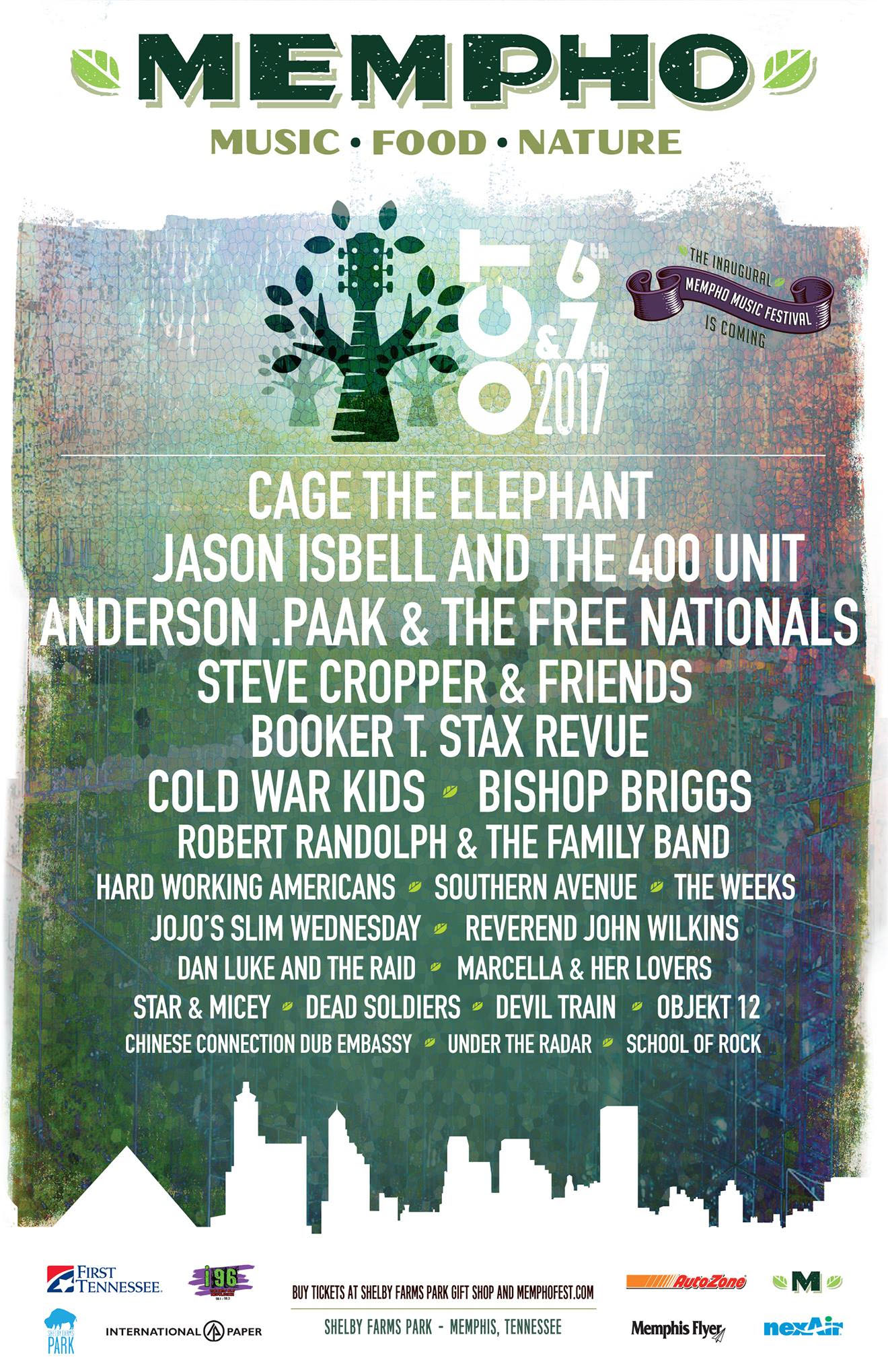 The inaugural MEMPHO Music Festival has a packed lineup featuring Grammy Award–winning artists Cage The Elephant, Jason Isbell & The 400 Unit, Grammy-nominated Anderson .Paak & The Free Nationals, as well as Cold War Kids, Bishop Briggs, Robert Randolph & The Family Band, Hard Working Americans, Southern Avenue among other featured performers. As a special tribute to the music of Memphis, legendary artists Steve Cropper & Friends and Booker T will present: A Stax Revue and A Journey thru Soul, Blues, and R&B.
