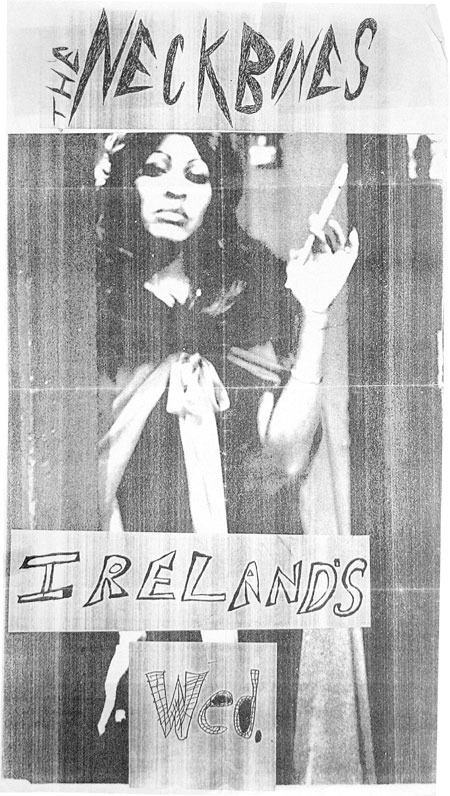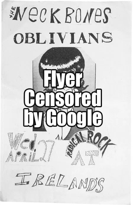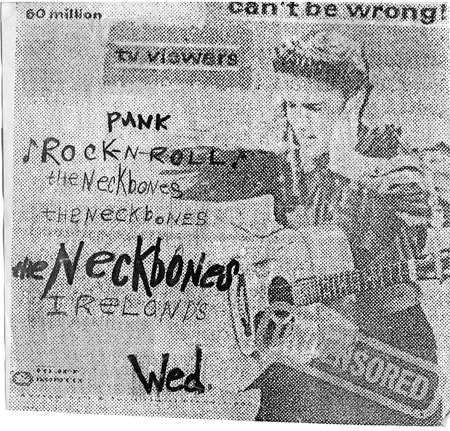 Publisher’s note: On July 20, 2017, The Local Voice was notified by Google Adsense that this page was in violation of their policies concerning “sexually suggestive or intended to sexually arouse. This includes, but is not limited to: pornographic images, videos, or games and sexually gratifying text, images, audio, or video.” We were told to either remove the content they would no longer serve ads to TheLocalVoice.net. Because it is not possible at this time to just remove their ads from just this one page on our site, we have been forced to censor the content of some of The Neckbones record covers, flyers, and videos. We adamantly disagree with Google’s assertion that we were serving pornographic images, but we have no recourse of action to challenge them. We apologize for having to remove The Neckbones original art.
