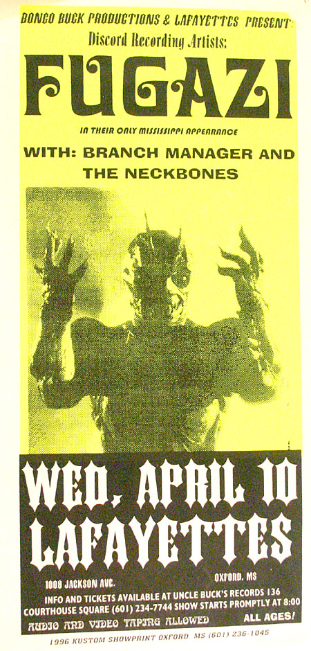 OK, back to some Neckbones stuff… You guys did a show back in the day with Fugazi at Lafayette’s, and that show ended up being part of Fugazi’s movie, Instrument, and there’s a section in that movie where they’re backstage at Lafayette’s and you can hear you guys playing in the movie. Tell me a little bit about that experience of playing with such a big band.