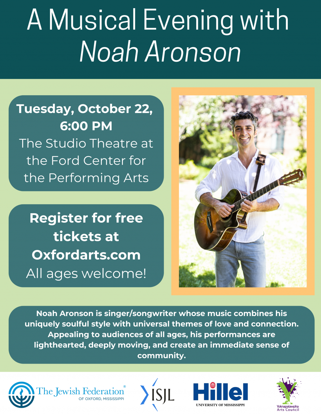 The Jewish Federation of Oxford is excited to announce a free concert featuring renowned musician Noah Aronson on October 22, 2024, at The Studio Theatre in the Gertrude Ford Center for the Performing Arts. Known for his soulful melodies and spiritually uplifting music, Aronson promises an evening of inspiring and dynamic performances.