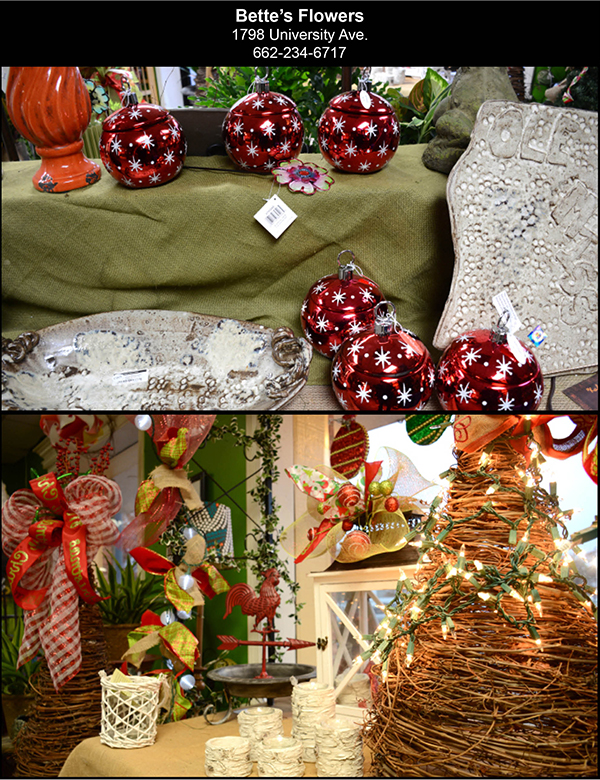 Bette’s Flowers has ornaments, gifts, small home furnishings, and flowers to accommodate all your Christmas and Hannukah needs. Bette’s also features work from local ceramicist Kudzu Pottery of Fulton, Miss.