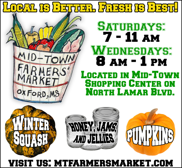 Directions to the market: From the Oxford Square, drive (or walk or bike!) north on North Lamar about ½ mile, and look for us on the left in the parking lot of the Mid-Town Shopping Plaza. Alternatively you can take the bus, utilizing the Oxford University Transit Red Route, which passes Mid-Town once per hour on Saturday mornings (http://www.oxfordms.net/