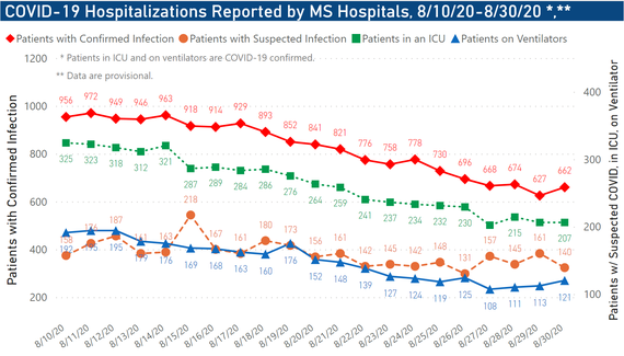 Currently there are 662 Mississippians hospitalized with confirmed COVID-19 infection. There are currently 201 people hospitalized in intensive care for confirmed COVID-19.