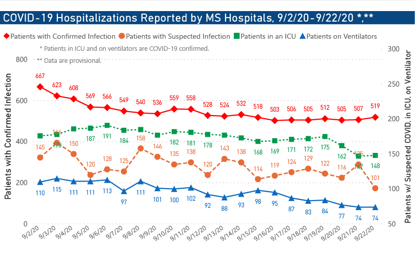 Currently there are 519 Mississippians hospitalized with confirmed COVID-19 infection. There are currently 147 people hospitalized in intensive care for confirmed COVID-19.