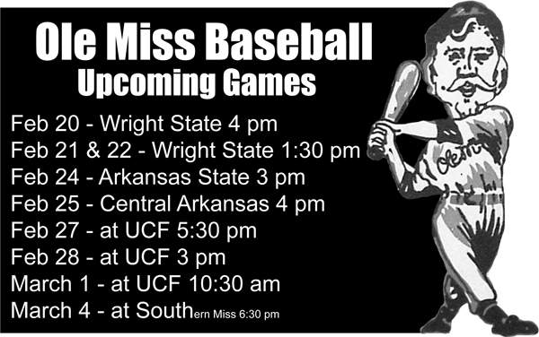 Looking forward, Ole Miss will hit the road with games against Central Florida, a three-game series on February 27–28 and March 1, and at Southern Miss on March 4th. ![]()