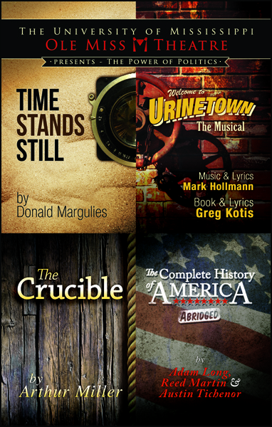 Ole Miss Theatre is gearing up for its 2012-2013 season, “The Power of Politics.” Due to recent exciting developments, some production dates have changed. Funding support provided through the Office of the Provost and the College of Liberal Arts has made it possible for needed renovations of Fulton Chapel and Meek Auditorium to begin fall semester. Norm Easterbrook, Director of the Ford Center and Matt Zerangue, Technical Coordinator of the Ford Center, have worked with the Department of Theatre Arts to allow two of the Ole Miss Theatre main stage productions to take place in the Ford Center during the scheduled renovations. The Ole Miss main stage productions featured for the 2012-2013 season are The Complete History of America (abridged), The Crucible, Urinetown, and Time Stands Still.