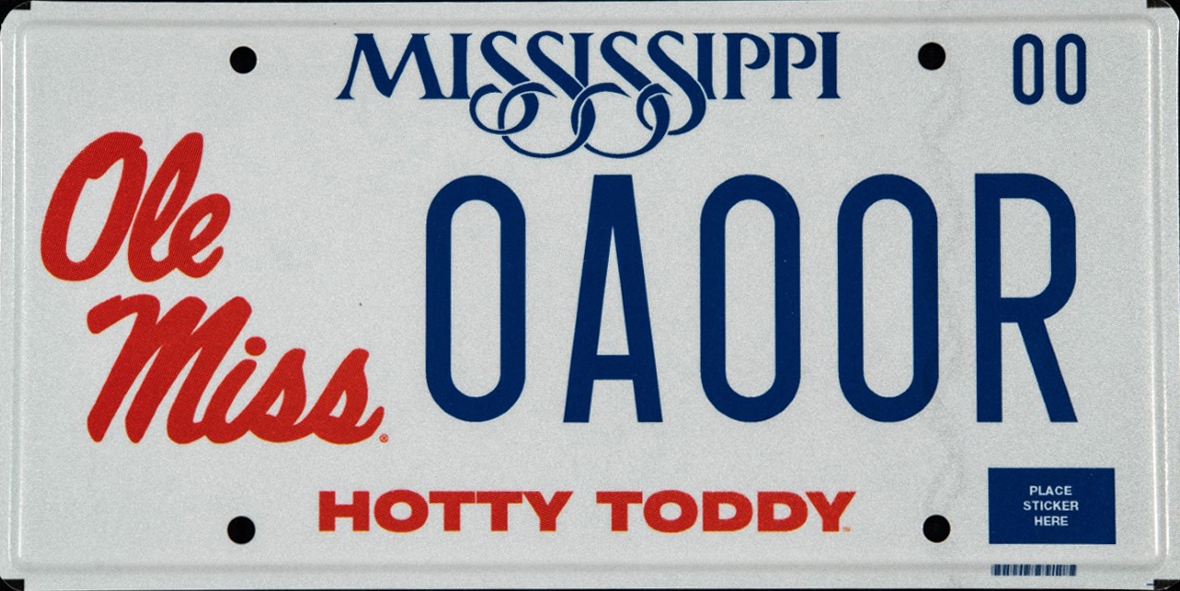 The new Mississippi license plate features the addition of “Hotty Toddy” across the bottom and an updated Ole Miss script logo to the left of the plate number.