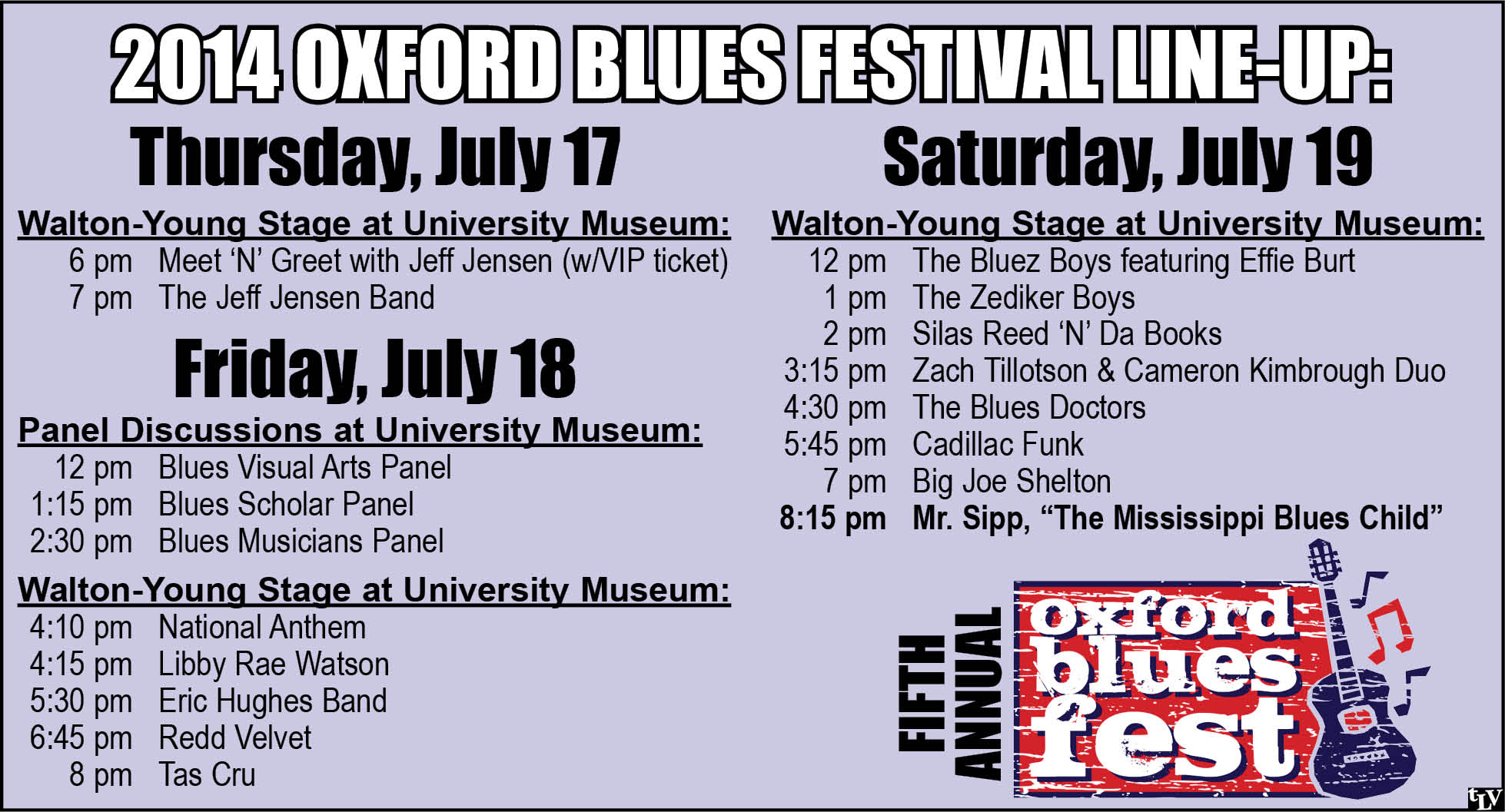 It’s that time of year again: Oxford Blues Festival is back for its fifth year! This year’s rain-or-shine festival will take place July 17–19 on the grounds of the Walton-Young Historic House, next to University Museum on the idyllic Ole Miss campus. On Friday and Saturday, ticketholders will have the opportunity to visit H.C. Porter’s Blues at Home exhibit inside University Museum for no charge—admission to this exhibit of striking Blues photographs is usually $5).