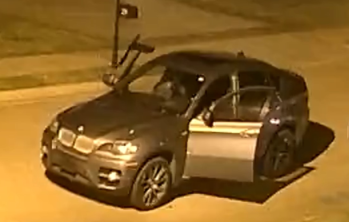 Suspect #1 is described as a male, wearing black pants, gray hoodie, and slide style shoes, with a beard. Suspect #2 is wearing a gray hoodie, black pants, solid white shoes, and has on a black mask. The suspects are driving a 2010-2014 Gray BMW X6, unknown license plate.
