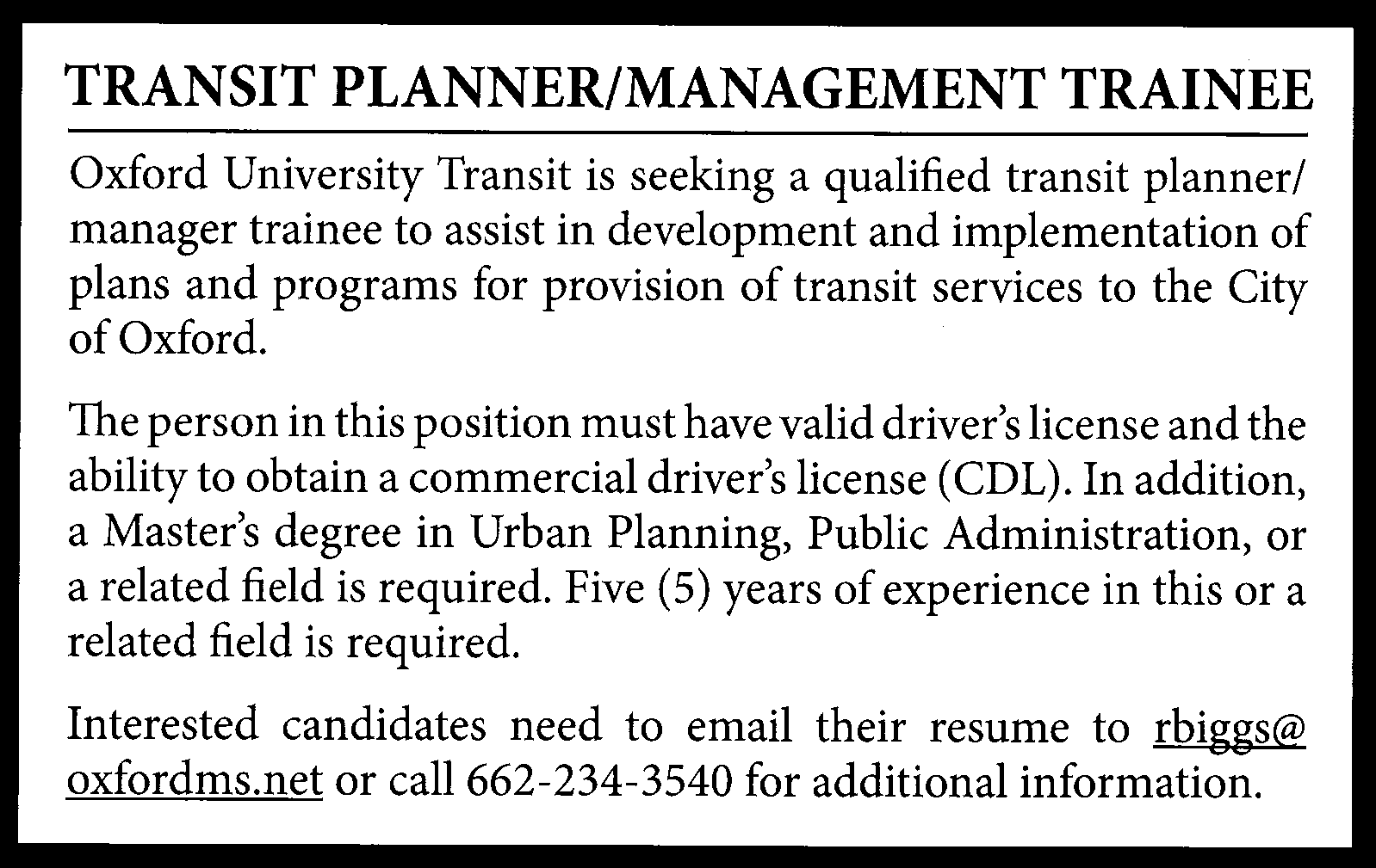 Oxford University Transit has a current opening for a qualified transit planner/management trainee. The details of the position as well as expected qualifications can be found below.