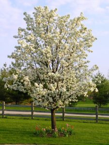 The Bradford Pear, an American variation of the Chinese Callery Pear, was developed by the US government in Maryland in 1963. It quickly became widely planted for its fast growth and lively colors, with stark white booms in the spring and vivid green leaves that last long into the fall. However, its fast growth resulted in very brittle trunks and branches. Bradford Pears are notorious for having limbs snap off of the main trunk and cause damage to property below. In addition to their weak structure, Bradford Pears are invasive and are known to produce an unpleasant odor. In fact, many city and local governments across the US have passed moratoriums banning its planting.