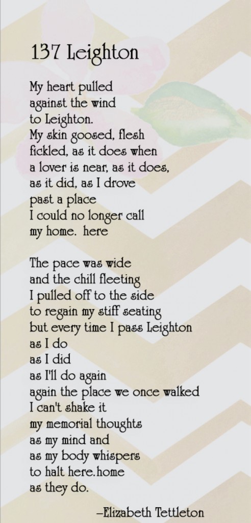 Elizabeth Tettleton Poem: “137 Leighton” by Elizabeth Tettleton Elizabeth Tettleton November 23, 2015 GEDSC DIGITAL CAMERA About the Author Elizabeth Tettleton Editor Visit Website View All Posts Post navigation Previous: A Manual For Cleaning Women Lucia Berlin & the American Short Story: Part TwoNext: Pam’s Pools & Spas Moves Location, Giving Away Hotty Toddy Hot Tub Leave a Reply Cancel replyYour email address will not be published. Required fields are marked *Comment * Name * Email * Website Notify me of follow-up comments by email. Notify me of new posts by email. Δ Related Stories 12 minutes read Elizabeth Tettleton John T. Isn’t the Problem, Reactionary Responses Are Elizabeth Tettleton July 9, 2020 0 1 minute read Charity Events Community Service & Volunteerism Elizabeth Tettleton Growing 300 Boxes of Free Produce to the Community Elizabeth Tettleton June 9, 2020 2 10 minutes read Elizabeth Tettleton Uncategorized Coming Together While Pulled Apart: The Oxford Community Thrives During COVID-19 Elizabeth Tettleton May 19, 2020 0