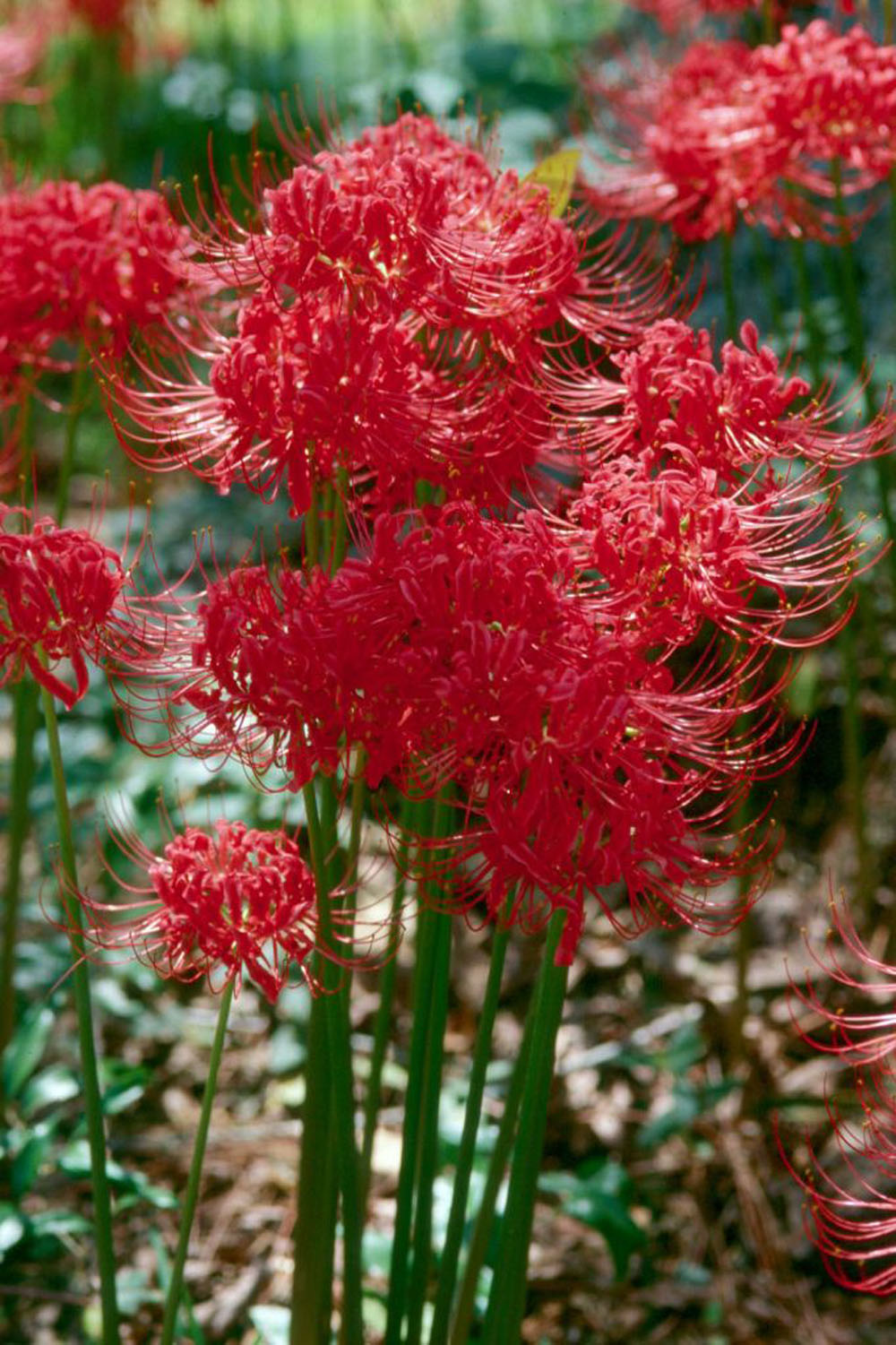 Plant red spider lily bulbs in the spring in fertile, organic-rich, well-drained beds in full or partial sun. Place the bulbs 3 to 4 inches deep, spacing 6 to 8 inches apart. They can be planted in straight lines for a formal look, but usually look better in bold, informal drifts. Water the blooming spider lily well to extend its floral show as long as possible.