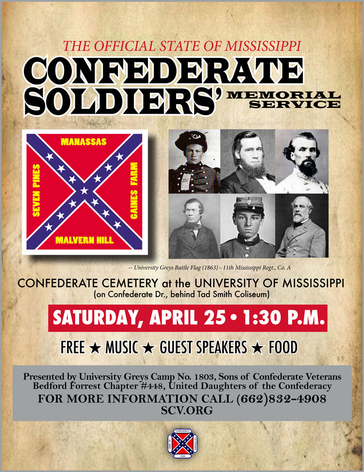 The Mississippi Sons of Confederate Veterans will be holding the “Official State of Mississippi Confederate Soldiers’ Memorial Service” in Oxford on Saturday, April 25, 2015.