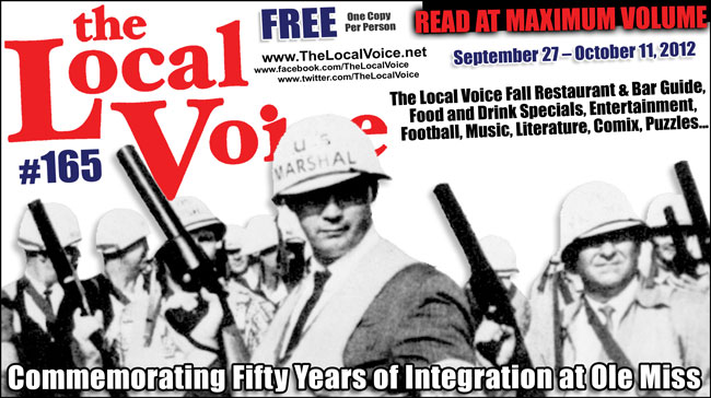 The Local Voice is out now! Download the Full Color Newspaper PDF covering Food & Drink Specials plus Entertainment and Events happening in Oxford, Mississippi from September 27-October 11, 2012.
