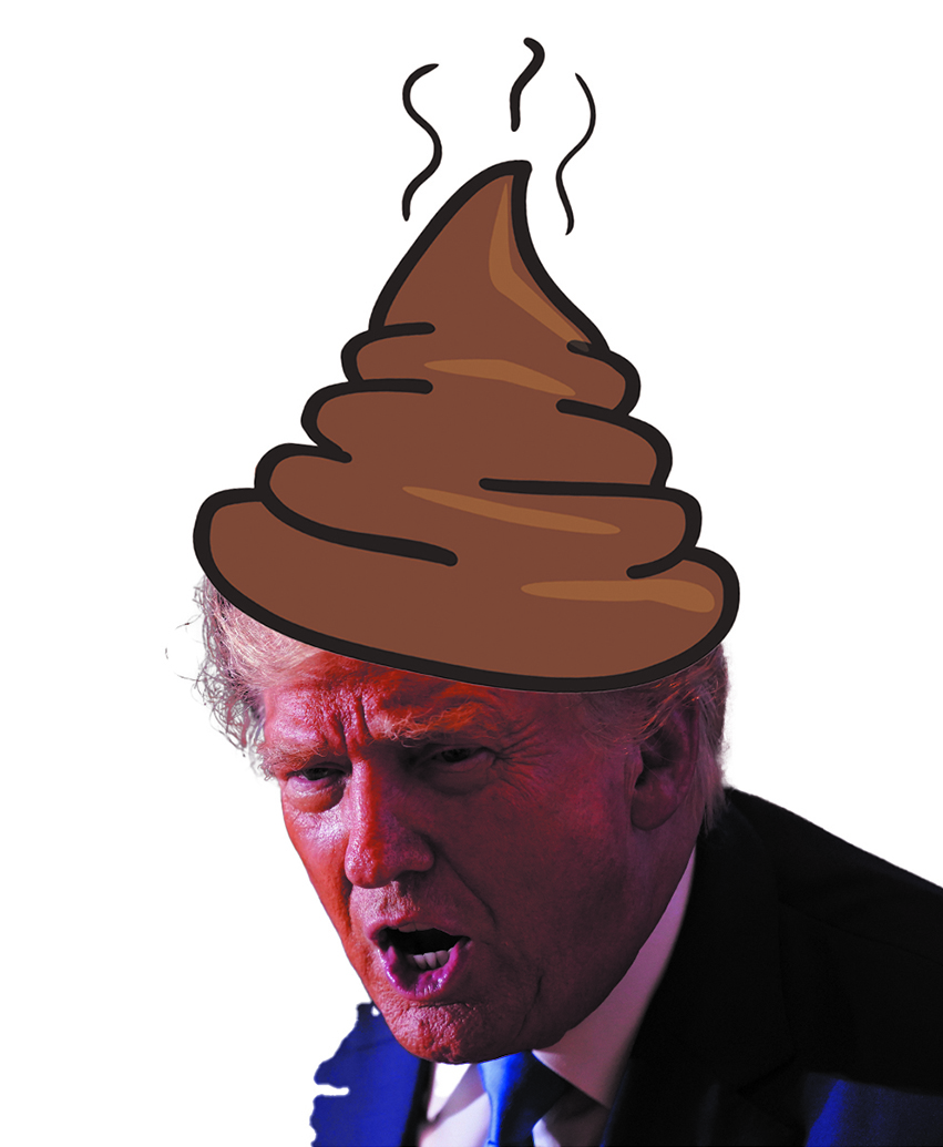 T-Rump glugged his mocktail, belched like a sperm whale’s blowhard hole, then turned orange. His comb-over poofed to the ceiling as though he were passing gas from the blowhard hole on top of his own head, then came back down looking very much like the pile-of-sh*t icon on the internet. He hurled his glass at the Falstaff sign and gave me the stink eye.