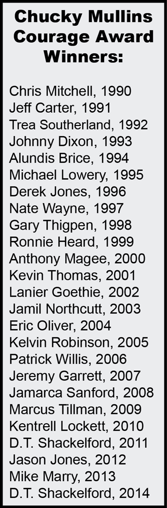 “I was in Oxford, at Vaught-Hemingway stadium, for the Ole Miss-Vanderbilt game (in 1999),” Ginn said. “It was a game that happened to fall on the 10-year anniversary of Chucky’s accident. During pregame ceremonies, the PA Announcer read a few words about the life and untimely death of Roy Lee “Chucky” Mullins. He then asked for a moment of silence, and for the first time in my life, I witnessed 40,000 people go silent in reverence. Not a single, solitary noise. I imagined that must have been how quiet it was on October 28th, 1989, when Chucky made his last tackle. At that moment, I felt as if those 40,000 fans were personally introducing me to Chucky, saying, ‘This is how we feel about our fallen hero; this is how much he means to us’.”