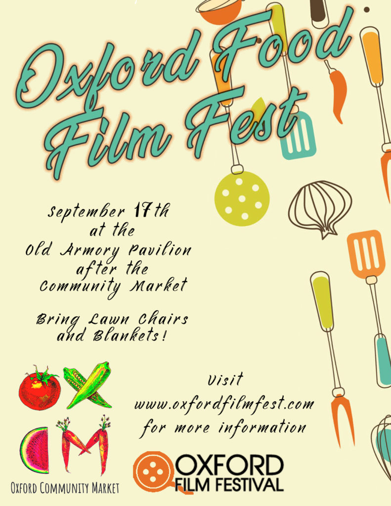 Old Armory Pavilion: Oxford Community Market (3–6:30 pm); Oxford Food Film Fest (free; starts after the market around 7 pm)