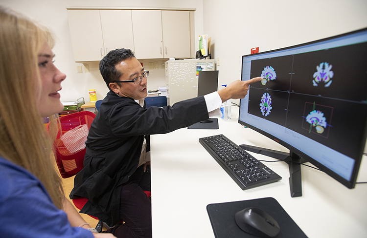 University of Mississippi biology major Nicole Jones works alongside communication sciences professor Tossi Ikuta in his digital neuroscience lab at the South Oxford Center. She authored a paper recently published in a peer-reviewed scientific journal, a remarkable achievement for an undergraduate researcher. Photo by Thomas Graning/Ole Miss Digital Imaging Services