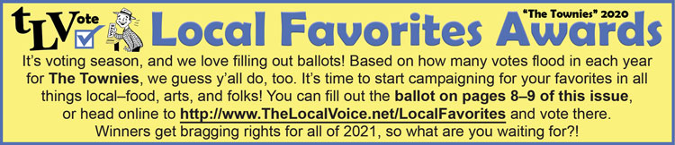 It’s time to start campaigning for your favorites in all things local–food, arts, and folks! You can fill out the ballot on pages 8–9 of the current Local Voice #360, or fill out the ballont online at http://www.TheLocalVoice.net/LocalFavorites. Voting ends at midnight on November 15, 2020.