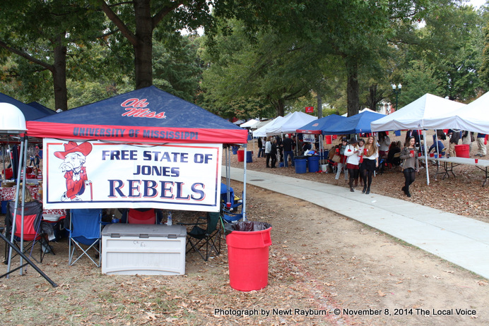 Presbyterian Blue Hose vs. Ole Miss Rebels – November 8, 2014. Photograph by Newt Rayburn – The Local Voice.“Today’s paid attendance: 60,546. Definitely doesn’t look that way now.” – @LocalAthletics – November 8, 2014 – Photograph by Newt Rayburn – The Local Voice.Freshman Quarterback Ryan Buchanan handing off to Jordan Wilikins for a 65-yard touchdown run against Presbyterian November 8, 2014. Photograph by Newt Rayburn – The Local Voice.Ole Miss Freshman Jordan Wilkins’ 65-yard touchdown run against Presbyterian November 8, 2014. Photograph by Newt Rayburn – The Local Voice.Ole Miss Freshman Andy Pappanastos kicked 5 of 6 Extra Point attempts against Presbyterian, while Senior Andrew Fletcher scored an Extra Point on his only attempt. Photograph by Newt Rayburn – The Local Voice.Ole Miss Freshman Quarterback DeVante Kincade in action against Presbyterian on November 8, 2014. Photograph by Newt Rayburn – The Local Voice.Ole Miss Quarterback Bo Wallace looks on as Freshman QB DeVante Kincade hugs the sideline against Presbyterian November 8, 2014. Photograph by Newt Rayburn – The Local Voice.Freshman DeVante Kincade rushed for 34 yards again Presbyterian November 8, 2014. Photograph by Newt Rayburn – The Local Voice.Ole Miss Head Coach Hugh Freeze and the Ole Miss Rebels are 8-2 in so far this year, and already bowl eligible with two games left this season: vs. Arkansas November 15 and the Egg Bowl hosting Mississippi State November 29. Photograph by Newt Rayburn – The Local Voice.Ole Miss Freshman Quarterback DeVante Kincade. Photograph by Newt Rayburn – November 8, 2014 – The Local Voice.The Grove was had plenty of tents but the large crowds as seen earlier this year were gone on November 8, 2014, after the Presbyterian game. Photograph by Newt Rayburn – The Local Voice.This tent in The Grove displayed a poster of Bo Wallace holding Laquon Treadwell’s hand after the unfortunate accident against Auburn November 1. Photograph by Newt Rayburn – The Local Voice.