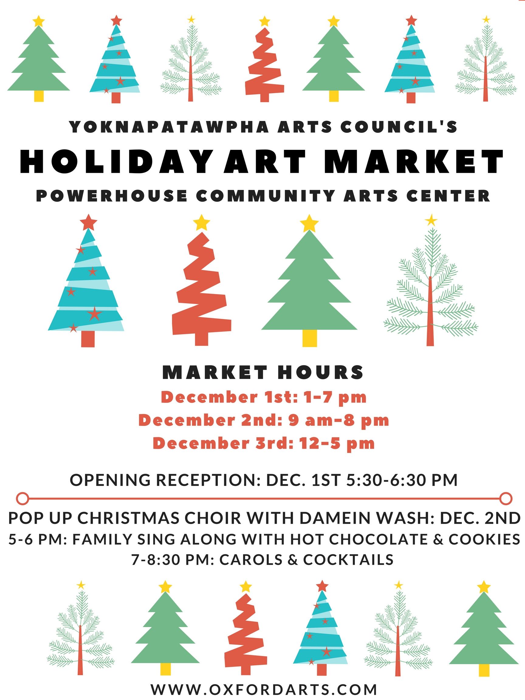 The Holiday Art Market provides artists a pop up retail location for the holiday season. The event has expanded this year to include both rooms of The Powerhouse offering 10′ x 6′ booths. We will offer an opening reception on Friday evening and have a live music performance on the Saturday evening with Damein Wash leading a Pop Up Christmas Choir!